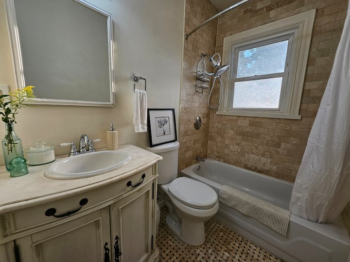 חדר הרחצה המשותף הקרוב ביותר בקומה השנייה הוא חדר רחצה משופץ הכולל אמבטיה עם ראש מקלחת גשם, כיור, שירותים, מגבות, נייר טואלט, שמפו, מרכך וסבון רחצה. מאחורי המראה נמצאת ערכת העזרה הראשונה שלנו.