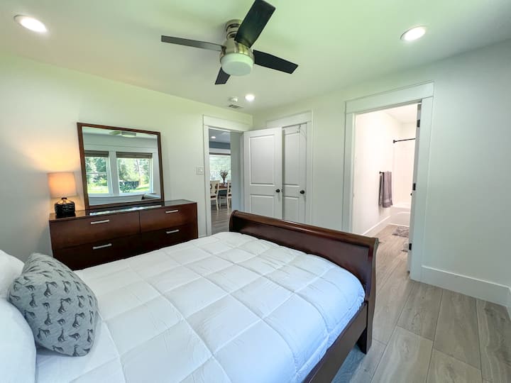 חדר השינה כולל מיטת קווין סייז נוחה, שידה, ארון אחסון ומאוורר תקרה. בסלון יש ספה, כורסה וסמארט טלוויזיה, מושלם למנוחה אחרי יום בחוץ.