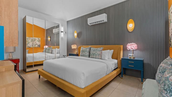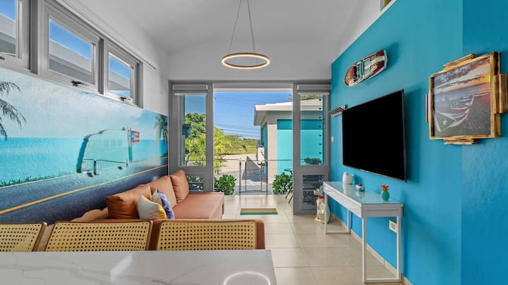 היכנסו לחלל מגורים תוסס ומסוגנן הכולל ציור קיר נועז, עיצוב שובב וספה נעימה שנפתחת למיטה לשניים - מושלמת למנוחה או לשינה אחרי יום בחוף הים. עם טלוויזיה עם מסך שטוח ומיזוג אוויר מלא, זה מקום מזמין להירגע או ליהנות מלילה שקט. ממש ליד הסלון, צאו החוצה למרפסת ותספגו את רוח החוף הרעננה.