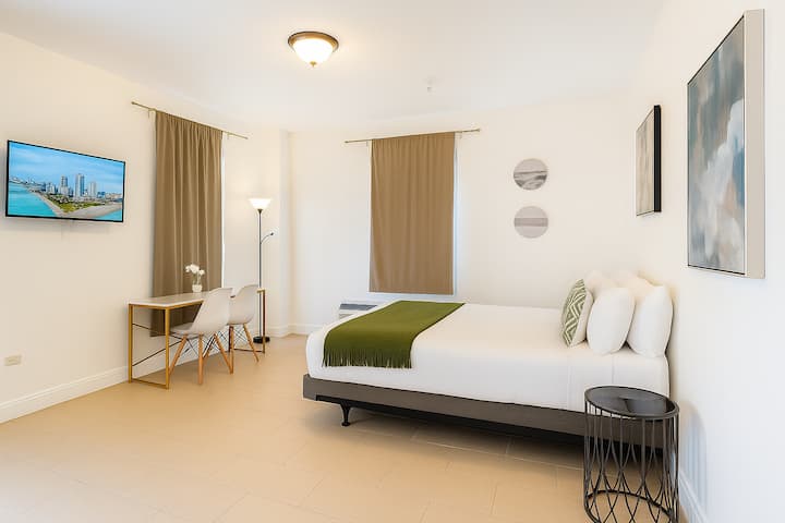 *אין חניה*. להתארח בבניין מקסים בסגנון ארט דקו במרחק רחוב אחד מחוף הים. לכו ל - Faena Club, מסעדות, מכולת וסטארבקס. כל הסטודיו לרשותכם. להירגע במיטה נוחה, להשתמש במטבחון המאובזר וליהנות מחדר רחצה מודרני. אנחנו במרחק של 2 ק"מ ממרכז הכנסים וקניון לינקולן רוד.