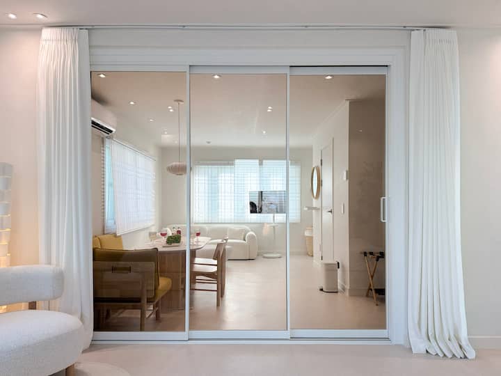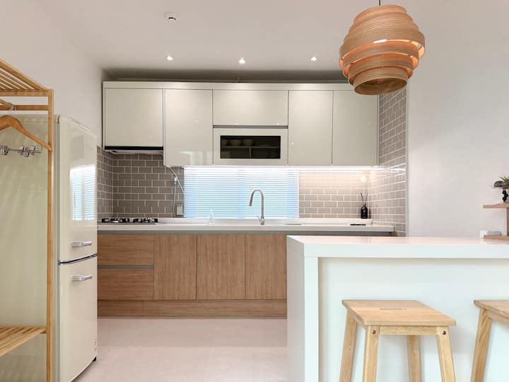 [הנחת אביב] מרחב רחב/4 דקות הליכה לרכבת התחתית/2 דקות הליכה לחוף הים/3 חדרים (4 מיטות קווין סייז)/2 חדרי רחצה/כביסה וייבוש זמינים