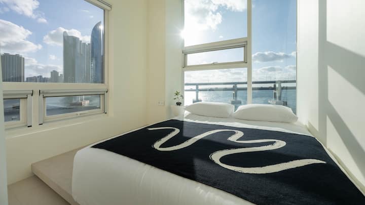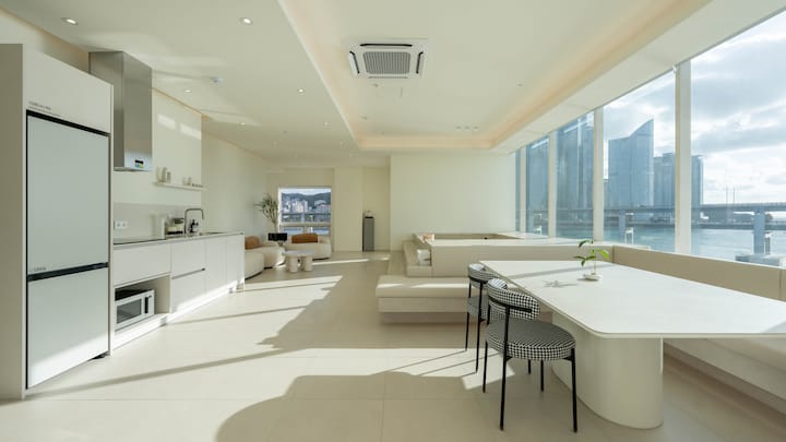מול פארק החוף גוואנגאלי, וילה יוקרתית עם נוף לאוקיינוס, גשר גוואנגאן ומרין סיטי במבט אחד.