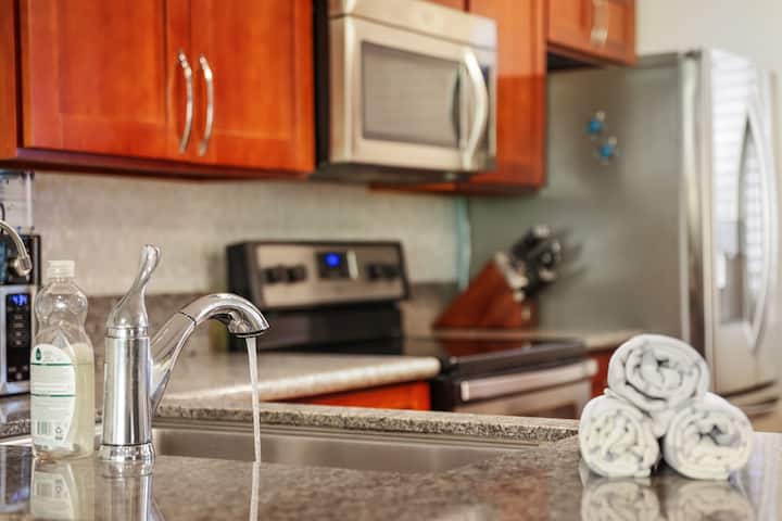 מטבח מצויד במלואו עם מכשירי חשמל חדשים, כל מה שצריך כדי לבשל, ומערכת מי שתייה מסוננת נוספת מתחת לכיור.