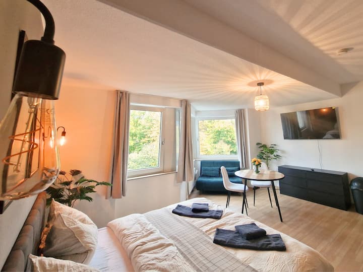 הסטודיו המודרני והמרוהט בטוב טעם ממוקם באחד האזורים הפופולריים ביותר של אסן – ממש ליד יער העיר, קרוב ליריד המסחר, לאוניברסיטה ולגרוגאפארק תרמה. מושלם לנוסעים בנסיעות עסקים, זוגות, מטופלים או אורחים לטווח ארוך שמעריכים גם נוחות וגם סטייל.