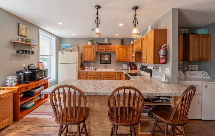 המטבח מצויד בכל שירותי הבישול הדרושים להכנת ארוחות, כמו גם מקרר בגודל מלא ומדיח כלים. הדירה כוללת גם מכונת כביסה וגם מייבש כביסה.