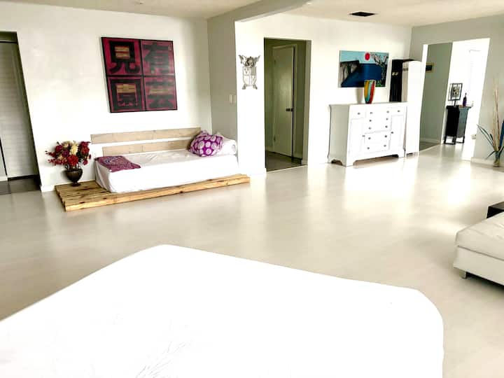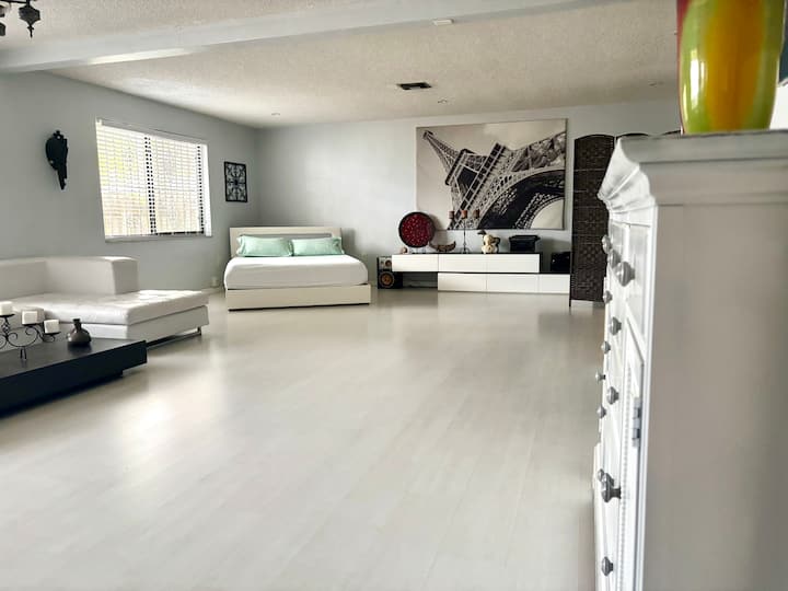 מיטת קווין סייז בסלון גדול ללא דלתות