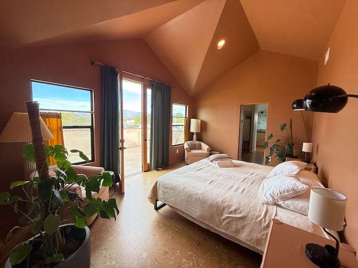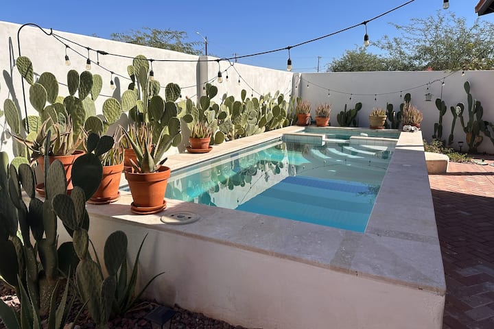 ברוכים הבאים למפלט צבעוני במרכז טוסון שנועד לעורר השראה. אור השמש זורם דרך חלונות פתוחים אל חללים מודגשים ומלאי אמנות, עם צמחים אמיתיים ואישיות. אפשר להירגע באחד משלושה חדרי שינה עם מיטת קינג סייז, לעבוד בנוחות ליד שולחן ייעודי או להתכנס במטבח המאובזר בתבליני גורמה. בחוץ, תוכלו ליהנות מחצר פנימית פרטית עם בריכה וג'קוזי, מוקפים בקקטוסים מקומיים ובאורות קפה זוהרים - נווה מדבר מזמין לבוקרים איטיים ולילות קסומים.