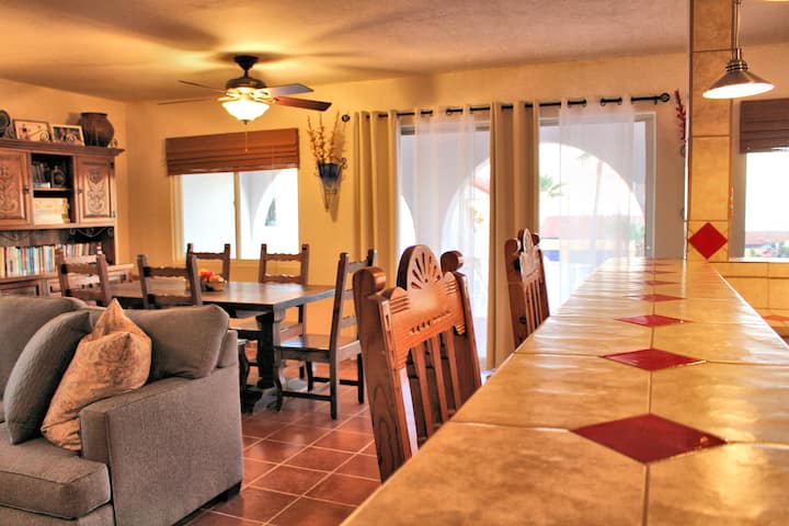 זה שלושה חדרי שינה, שני בתי מרחץ עם תוכנית קומה פתוחה. הסלון, פינת האוכל והמטבח נראים זורמים אחד לתוך השני. הבית הזה קצת יותר ישן מהאחרים בלאס קונצ'ס, אבל (אנחנו מקווים שתסכימו) מקסים מאוד! כרגע, אין לנו גישה לאינטרנט (אנחנו ברשימת המתנה ב - Las Conchas) אבל אנחנו מזמינים אתכם להתנתק וליהנות אחד מהשני! עם זאת, יש לנו טלוויזיות, מכשירי וידאו ו/או נגני DVD בכל החדרים והסלון. יש לנו מבחר די גדול של סרטי די .וי .די, קלטות וידאו, ספרים, משחקים, פאזלים ועוד שם למטה! יש מקלחת רגליים קטנה מחוץ למרפסת הקדמית שממש עוזרת לשמור על רמת חול נמוכה בבית. אנחנו במרחק רחוב אחד מהחוף, בערך 30 שניות הליכה. אנחנו חולקים גישה פנטסטית לחוף. בים קורטז יש שוני גאות ושפל גדול מאוד שמאפשר חופים חוליים ובריכות גאות אדירות. במסדרון תוכלו למצוא כיסאות חוף, עפיפונים וצעצועי חול/חוף להנאתכם. בבית שלנו אין תנור, אבל יש לנו מיקרוגל, סיר חרס, טוסטר, ברביקיו, וכיריים חשמליים 5 צורב בגודל מלא.
