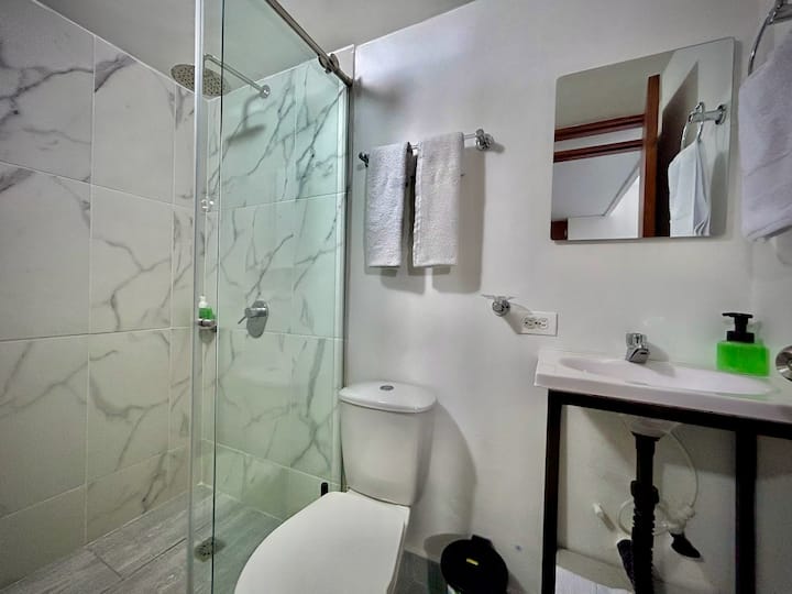 חדר רחצה מלא: מקלחת עם מים חמים, מגבות (גוף וידיים), סבון גוף וסבון ידיים, נייר טואלט ושטיחון רחצה.