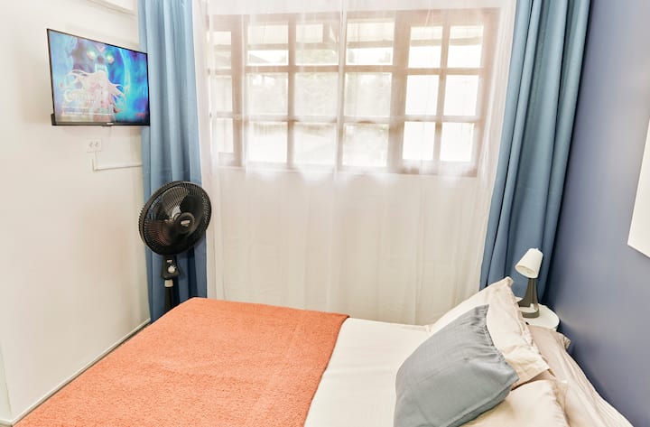 חדר שינה שקט: אטמי אוזניים למקרה שהרעש מהשדרה יפריע לכם, מיטה באורך 1.40 מטר עם מצעים מלאים, ארבע כריות ושמיכה לשינה רגועה.