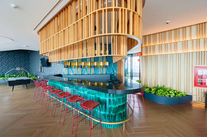 דירת חדר שינה צבעונית ומפוארת | בריכת גג, חדר כושר וטלוויזיה