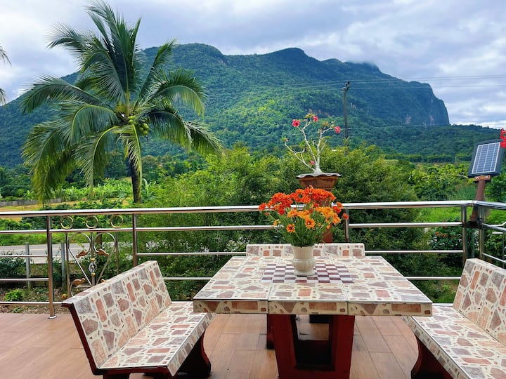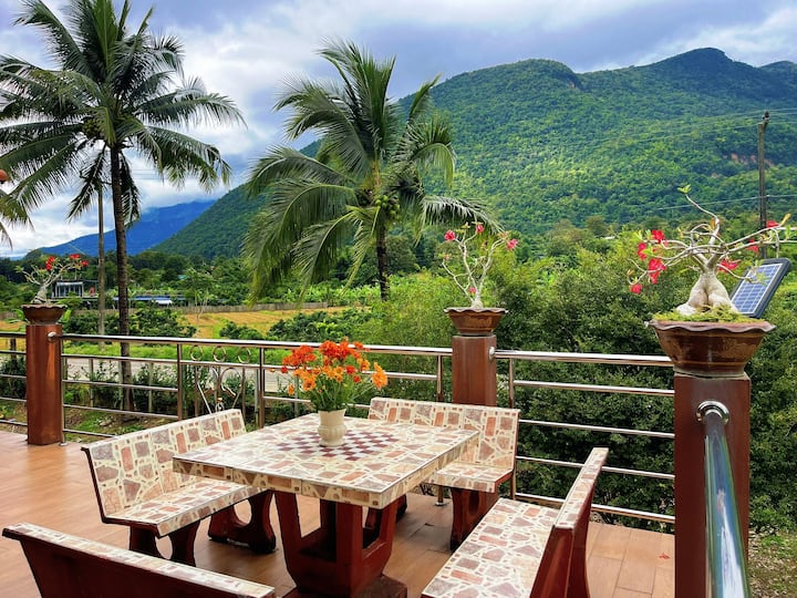 וילה עם נוף להר השקיעה ליד נהר זורם