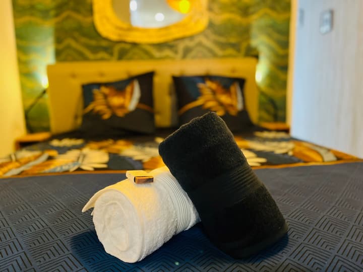 מצעים, מגבות, חלוקי רחצה ונעלי בית כלולים. המיטה סודרת.