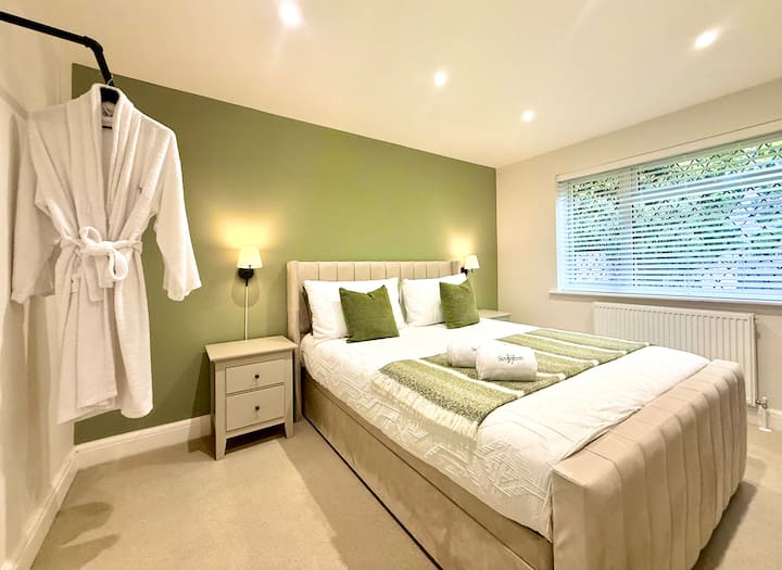 חדר השינה הראשי עם מיטת קינג סייז וחדר השינה הכפול ממוקמים מאחור, משקיפים על גינה פרטית מלאה בצמחייה ועצים בוגרים – מושלם לשינה שקטה ונעימה.