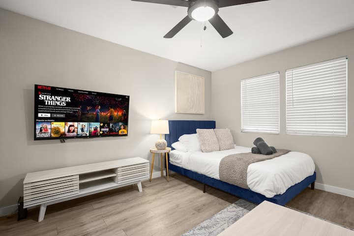 ברוכים הבאים לדירת הסטודיו המודרנית והנעימה שלכם בצפון אוסטין - רק כמה דקות מהדומיין ומהאצטדיון Q2! החלל המעוצב הזה כולל מיטת קווין סייז נוחה, ספה נפתחת, טלוויזיה חכמה עם סטרימינג, Wi-Fi מהיר, מטבחון מצויד ומייבש כביסה. ממוקם בשכונה שקטה ומחוברת היטב עם גישה מהירה למסעדות, חנויות ובידור הטובים ביותר באוסטין. מושלמת לנוסעים יחידים, זוגות או נסיעות עסקים שמחפשים נוחות ונוחות.