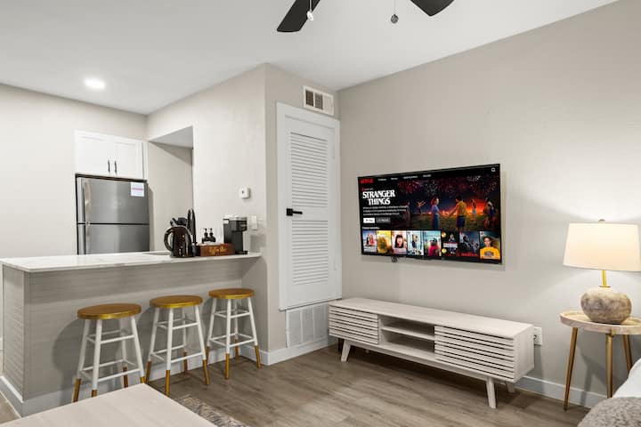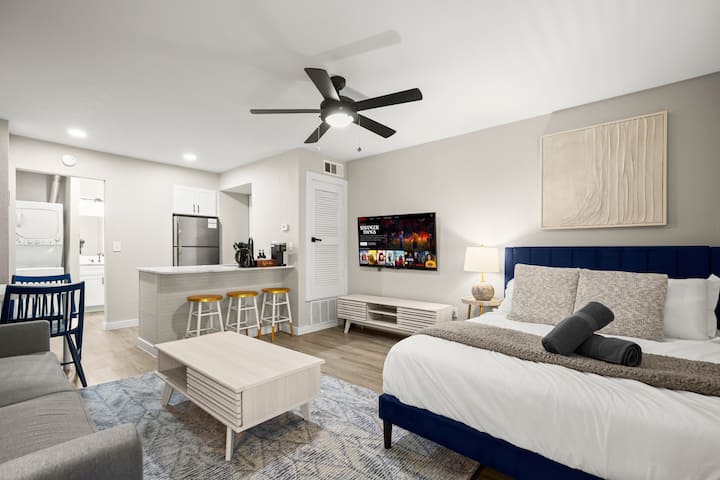 ההרפתקה הבאה שלכם באוסטין מתחילה בסטודיו המודרני הזה בצפון אוסטין - דקות ספורות מהדומיין, אצטדיון Q2, וכמה מהאוכל, הקניות והבידור הטובים ביותר בעיר.