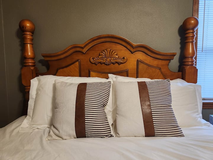 חדר שינה נעים עם מיטת קווין סייז בבית משותף.
