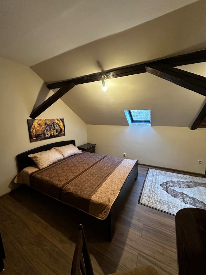 חדר עליית גג עם אווירה של בקתה בהרים