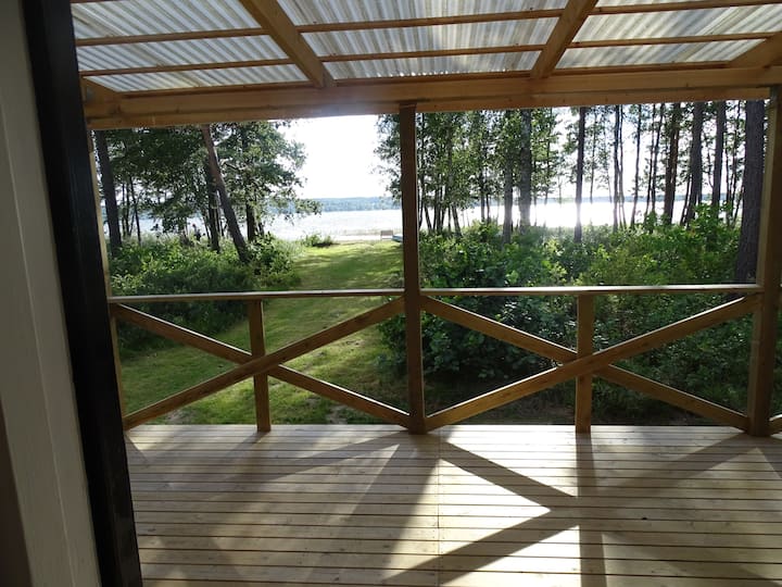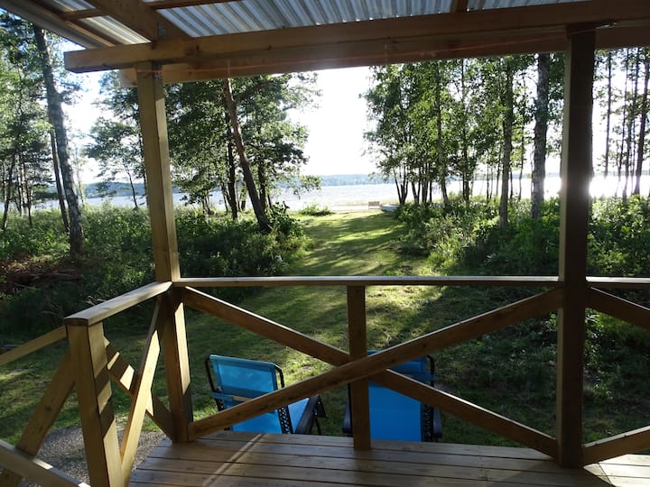בקתה יפה על שפת האגם עם חוף פרטי