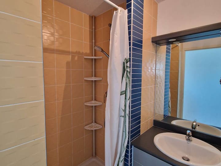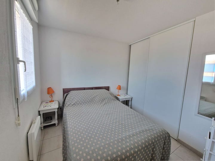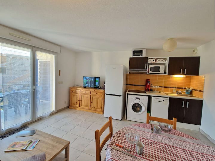 A bright living room with a sofa bed, table, chairs, and TV. A fully equipped kitchen area: ceramic hob, microwave, mini oven, fridge-freezer, Senseo coffee machine, washing machine, and dishwasher. A cozy bedroom with a double bed and TV. A cabin area with two bunk beds, ideal for children. A bathroom with shower and sink. Separate WC for added convenience. A private parking space in a secure residence with electric gate.