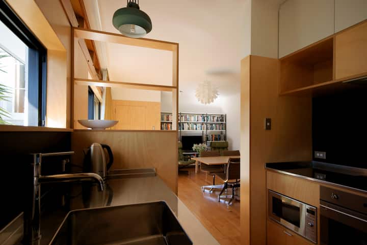 דירה שטופת שמש ומסוגננת המשקיפה על הגינה.