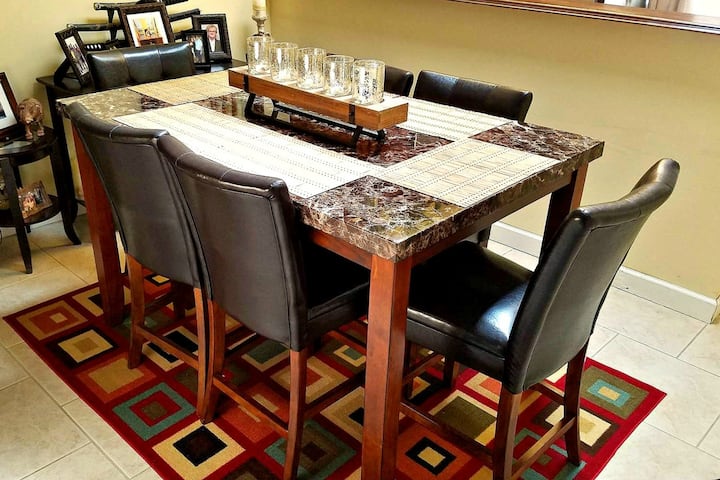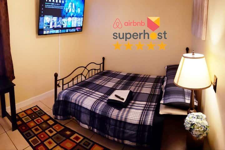 2) שירותים לאורח - אני מספק פריטים חיוניים בסיסיים, כלומר כל החדרים שאני מציע מגיעים עם מיטת קווין סייז סטנדרטית ונוחה מספיק לשני אורחים, כריות, מצעים/כריות, מגבות, נייר טואלט, ארון עם קולבים, שולחן כתיבה ומאוורר תקרה עם תאורה לבנה רכה. תהיה לכם גם גישה למגהץ/קרש גיהוץ, להכנת קפה ולטוסטר. יש לי מצלמות אבטחה באזורים המשותפים של הבית שלי, הכוללות את המטבח, הסלון ואזורי החניה החיצוניים.