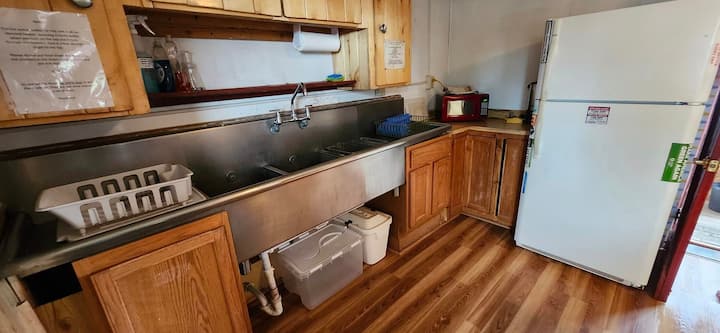 בקתת בישול עם כיריים בישול, מקרר, כיור, ארונות, כלים, שולחנות עם מקומות ישיבה לעשרה אנשים בפנים ו -4 -6 בחוץ, תנור עץ לחימום ופחי מיחזור.