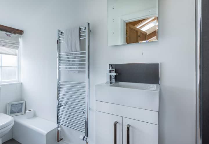 בית החווה בן 400 השנים שלנו הוא מקום יפהפה ומרתק. צעדו דרך המרפסת ועל רצפת הצפחה המקורית של קורניש – אידיאלי למגפי הליכה בוציים. הלוחות לוקחים אתכם לחדר האוכל או ישר דרך מטבח מסורתי עם כיור קורניש*, כיריים גדולות עם כיריים קרמיות ושולחן וכיסאות של בית חווה. הדחת כלים היא כמעט תענוג עם הנוף לים ולשדות הבקר, אבל יש, כמובן, מדיח כלים. יש גם אזור שירותים קטן עם מכונת כביסה ומייבש כביסה.
