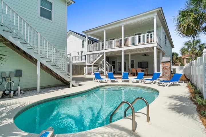 🐬 ברוכים הבאים ל-Dolphin Retreat! בית מרווח וידידותי למשפחות עם בריכה פרטית ועגלת גולף, כמה צעדים מחוף הים.