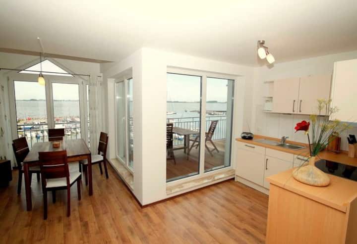 דירת הנופש Rügen in Wiek ממוקמת בשורה הראשונה עם נוף ישיר לנמל Wieker, Wieker Bodden לאי Hiddensee.