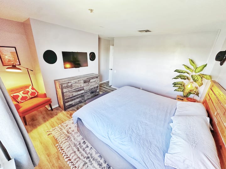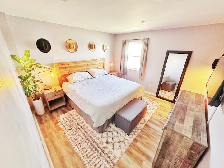 חדר שינה עם מיטת קינג סייז במרכז העיר על גדת הנהר