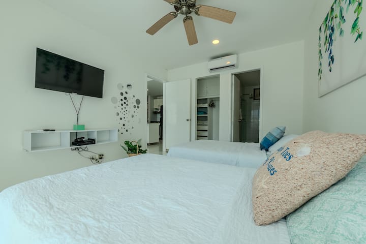 🛏 חדר שינה ראשי: 2 מיטות זוגיות, חדר רחצה פרטי, מיזוג אוויר וטלוויזיה.