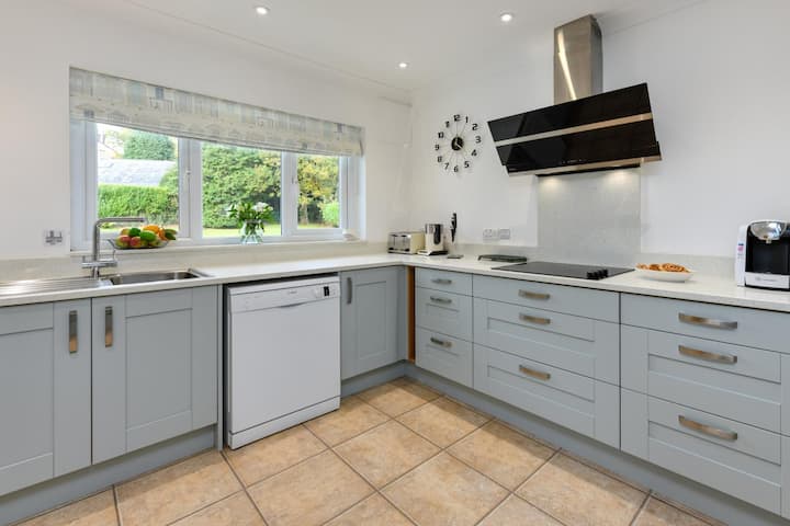 - מטבח מרווח וחדש עם יחידות מותאמות בצבע כחול מודרני, תנור חשמלי וגריל משולבים, כיריים ומשאבה נפרדים, מיקרוגל/גריל משולבים בגובה העיניים, מדיח כלים, מקרר/מקפיא בסגנון מזווה, מכונת קפה Tassimo, אספקת מים קרים מסוננים, מזווה בגובה מלא ואחסון כלי חרס.