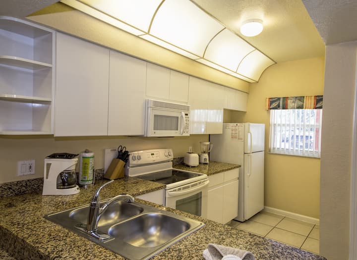 The condo association provides free transportation to local theme parks and outlet malls, onsite dining options and a variety of activities, or simply relax and splash around of the outdoor pools.