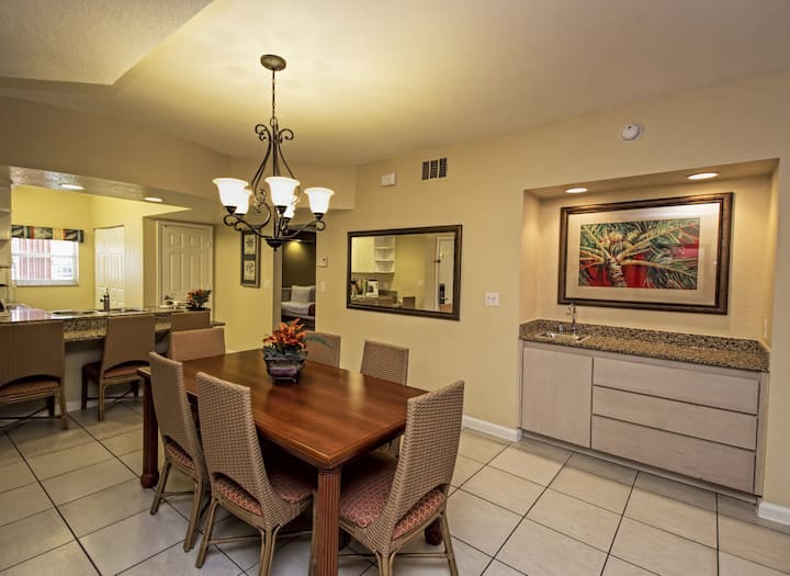 The beautifully decorated Three-Bedroom Deluxe Condo offers astonishing spaciousness – 1,811 square feet of space and room for up to 12 guests. It's ideal for a large family seeking all the comforts of home in a Resort area within minutes of theme parks and attractions.