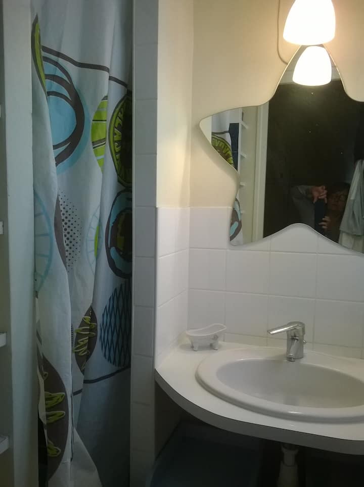 חדר אמבטיה קטן עם מקלחת וכיור, 2 פחים (