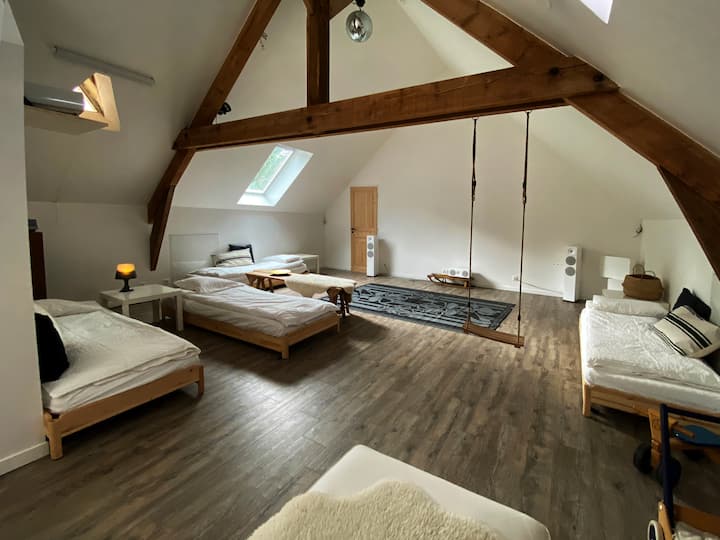 בעליית הגג, חדר רב - תחומי גדול... חדר משחקים לסירוגין ( עם משחקים וספרי ילדים, ואפילו נדנדה), מעונות עם מיטות יחיד או קולנוע ביתי עם הקרנת תמונה של 4 מטר. אתם יכולים להביא את ה - DVD או המחשב האהובים עליכם (חיבור HDMI). אנחנו גם מספקים כונן קשיח באתר עם 2TB של סרטים מכל הסוגים.