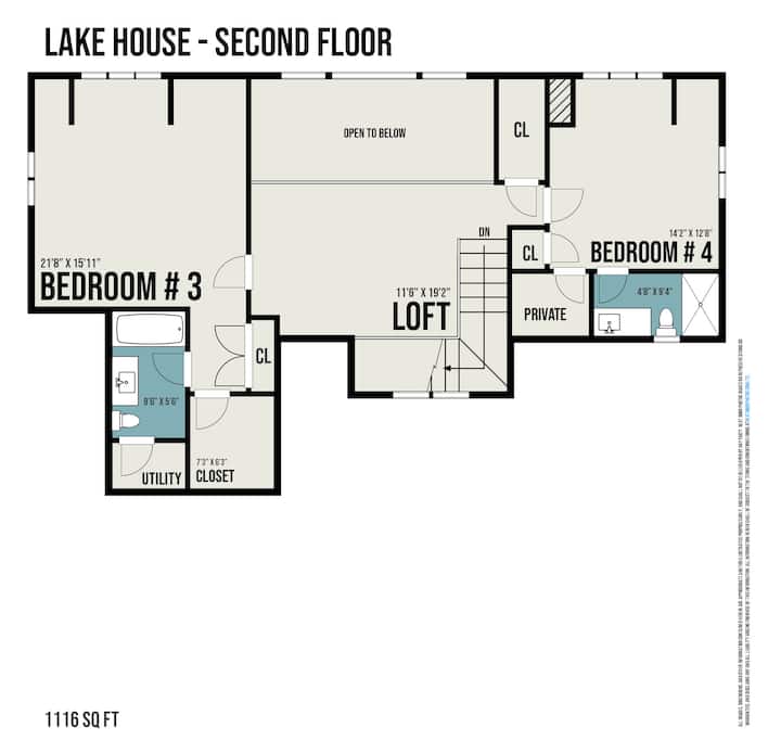 חדר מס '3 - סוויטת אורחים (קומה 2) כוללת מיטת קווין סייז אחת, שתי מיטות נפרדות, חדר רחצה פרטי עם אמבטיה/מקלחת וארון. אזור אחסון נוסף ל - Pack 'n Play, צעצועים ופריטים נוספים. ליהנות מנופים ללא הפרעה של האגם, המשקיף על המרפסת ובור האש.