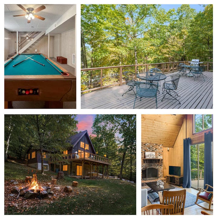בקתה נעימה עם מדורת גן, ג'קוזי, דק ושולחן ביליארד