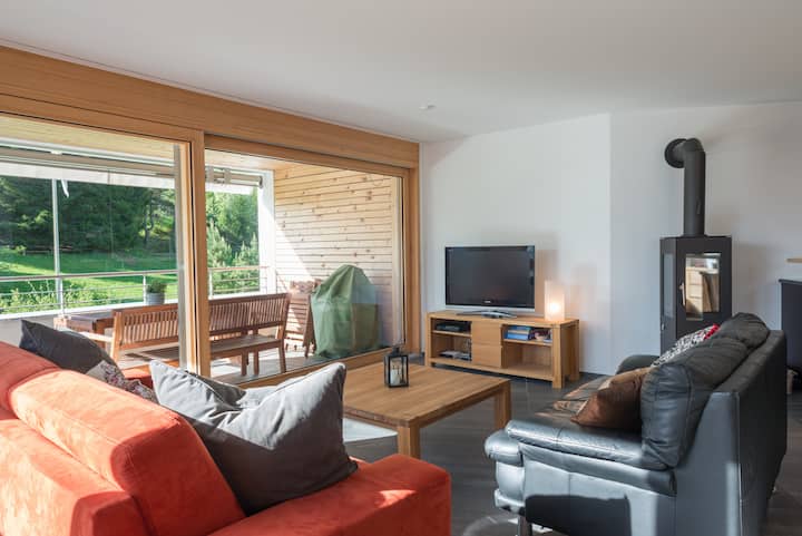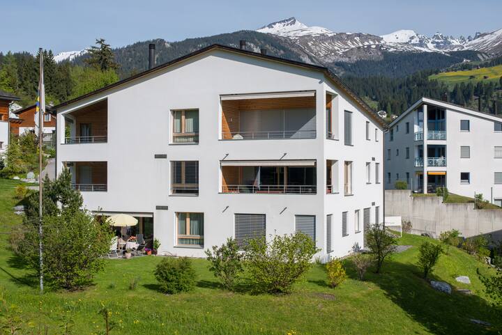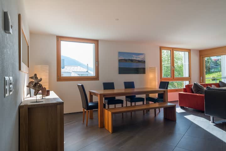 Modern 3.5-room apartment in Flims Waldhaus. The apartment features high-quality interior furnishings. It offers two bedrooms with double beds, one of which has an en suite bathroom. An additional bathroom with a bathtub completes this wonderful apartment. The spacious and bright living room, with an open, fully equipped kitchen and fireplace, invites relaxation.