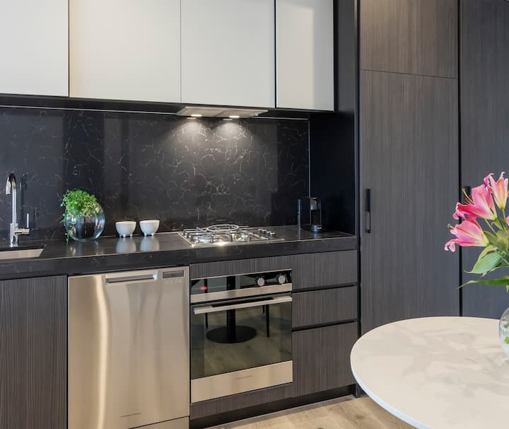 חדר שינה אחד מודרני עם מטבח מלא וכביסה