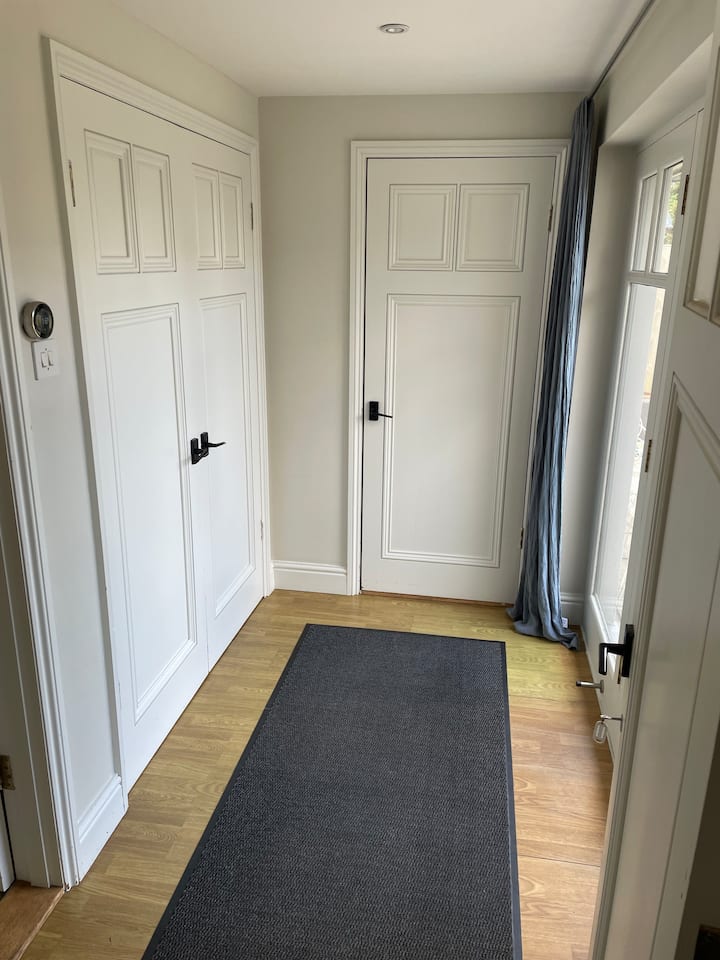 מסדרון >>> במסדרון הכניסה יש דלת צרפתית מזכוכית, עם וילונות מצעים שופעים כדי לתת לכם פרטיות. יש הרבה וו ורצפה לכל הבגדים החיצוניים שלכם!