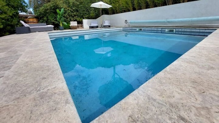 בריכת השחייה 6x6 מאובטחת על ידי אזעקה. שיזוף וסונטה ידנית לקטנים או לתנומה בצל הבריכה ממתינים לכם.