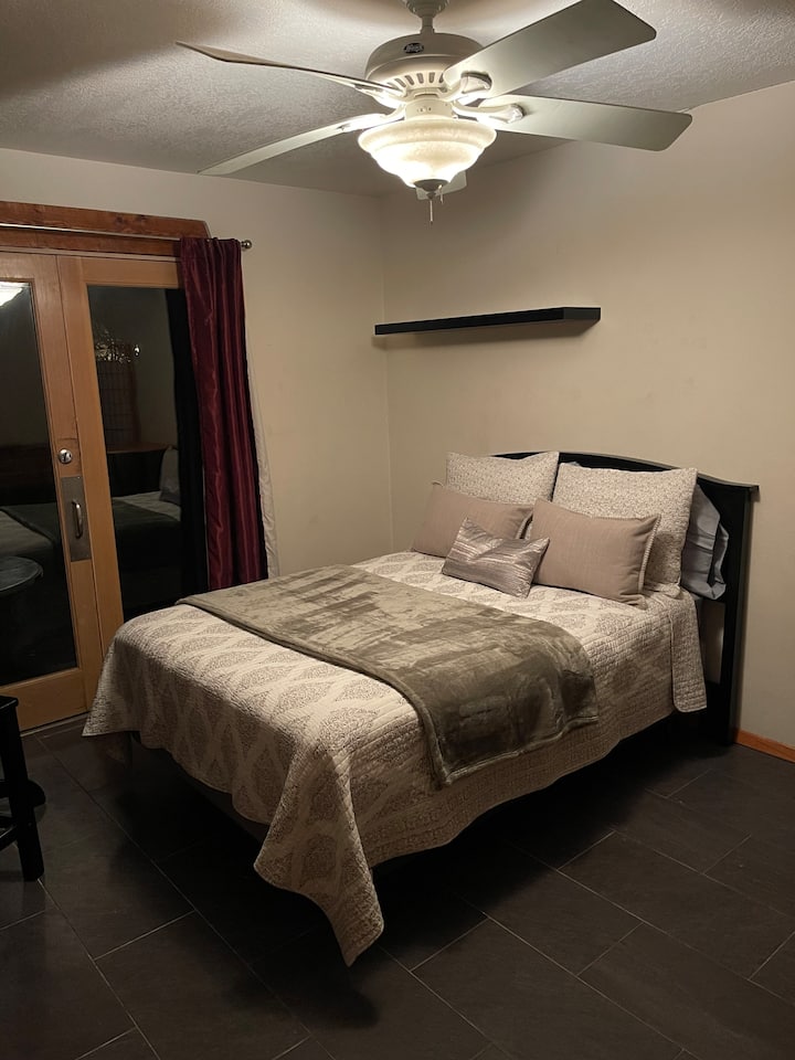 שביל נהר ליד מרכז העיר עם אח ומיטת קינג סייז