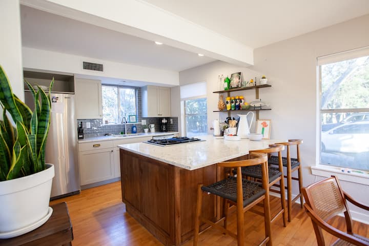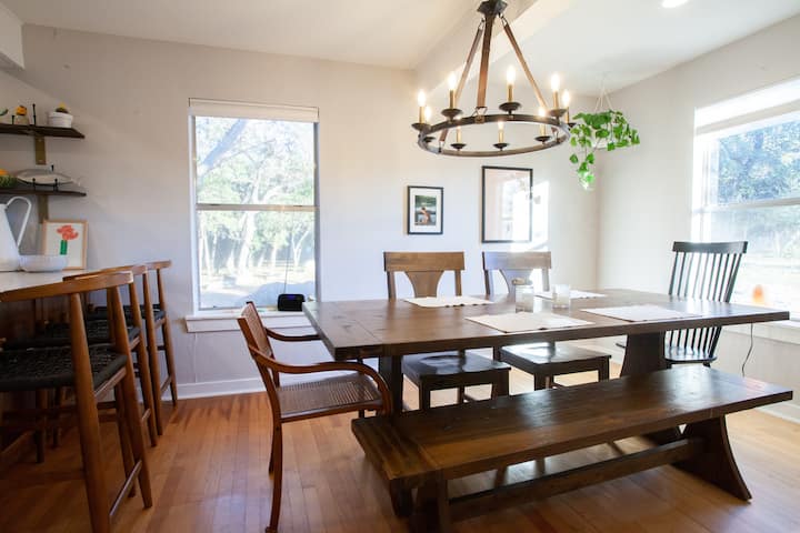 הסלון מספק מקומות ישיבה בשפע כדי להירגע בערבים עם ספת קווין סייז, פינת אהבה מלאה, 2 כורסאות נוחות וכמה כיסאות במבוק נוספים מאמצע המאה ה -20. פינת האוכל מארחת ארוחות חג נהדרות עם שולחן משפחתי יפהפה ל -8 מושבים ועוד 2 על שרפרפי האי הסמוכים. תיהנו מבוקר רגוע, אחר הצהריים או ערב במרפסת המסך (הוכחה לחרקים), שנהדרת למשחקי לוח או לארוחות ערב גדולות בחוץ בערבים. אפשר למצוא פינת אוכל נוספת בחוץ במרפסת הראשית הסמוכה ושולחן הפיקניק בשטח התחתון. שטח אחסון גדול ליד המקרר מספק מזווה נגיש למצרכים של האורחים.