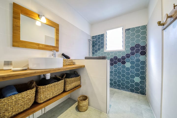 חדר האמבטיה משלב עץ וחומרים מודרניים עם צבעי קרקעית הים להרפיה מוחלטת.