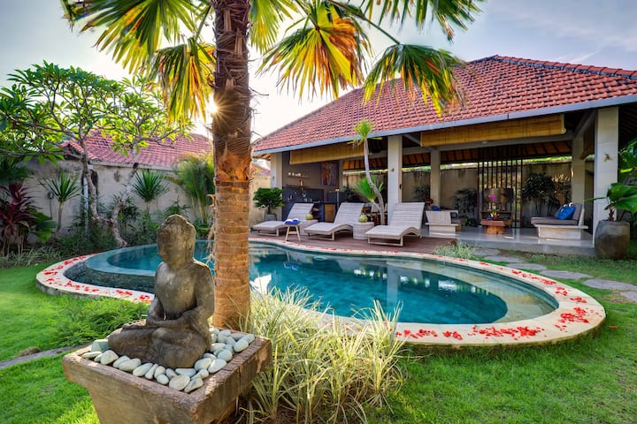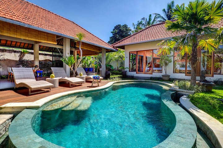 הרבה מחשבה הושקעה בתכנון כל פרט בווילה והוא משופץ ושודרג באופן קבוע. בווילה יש חדר שינה ראשי ממוזג עם חדר רחצה צמוד, עם מקלחת חיצונית מדהימה. שני הבניינים (חדר השינה והסלון) מסודרים בצורת L סביב בריכת האינסוף המעוקלת במרכז הגן, ויוצרת תחושה אקזוטית ונעימה מאוד של מרחב והרמוניה. הסלון הפתוח מזמין להירגע ולהירגע כל היום ומצויד ברהיטים מעוצבים היטב, Wi - Fi בחינם, טלוויזיית LED עם כבלים ואוסף DVD ומטבח עם פינת אוכל. אזור הגן משדר תחושה מאוד נעימה וטרופית והבריכה מושלמת להתקרר בשעות החמות או לשחייה בערב. שדות האורז שמסביב ועצי הדקל באזור מספקים רקע שליו – מושלם להירגע!