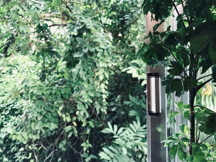דירה עם חלון ירוק גדול קרובה מאוד לחוף הים.