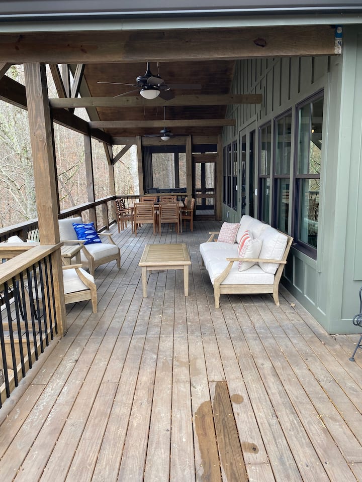 שתי דקים מכוסות ענק המשקיפות על האגם (1,500 רגל רבוע). הדק העליון מציע גריל גז גדול, פינת ישיבה, שולחן אוכל ל -8 אנשים ומרפסת עם מיטת יום תלויה ושולחן אוכל עם 4 קומות. הדק התחתון כולל פינת ישיבה, שולחן אוכל, סט משחק קורנ הול וג'קוזי ל-7 אנשים (תשלום נוסף של 75 דולר לשהייה חל על השכרת ג'קוזי לתקופה של פחות מ-7 ימים). הנוף משני הדקים משקיף על המפרץ. מעבר למפרץ יש אדמת TVA מיוערת עם הרבה חיות בר (צבאים, רקונים, נשרים, אנפות ועוד). מדרגות מהדק התחתון מובילות למדרגות לרציף שלנו.