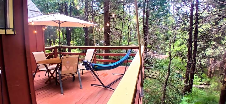 פנים האורן הסבוך הוא 'בקתה' אותנטית בכל דרך, ורהיטים משנות ה -60 המאוחרות/תחילת שנות ה -70 ללא רבב יזרקו אתכם לעידן אחר כשאתם יושבים ליד אח עצים מאבן בסלון המרווח והנעים, עם רדיו ארט דקו משנות ה -20, כיסאות נדנדה וינטג' ועיצוב בטוב טעם. תוכלו ליהנות מהדק האחורי הגדול כל השנה, לאכול בחוץ ליד שולחן עץ טיק, או להסתכל דרך אורני הבהמה שמעליכם כשאתם מתנודדים בערסל ונושמים את אוויר ההרים הצח, כל עונה עם טעם ייחודי משלה. צפו בעצים מתנדנדים ברוח ביום, ובצלליות שלהם בין הכוכבים בלילה. לבשל סעודה מלאה על הכיריים היפים עם מכסה הזכוכית, שיושב באלגנטיות עם משטחי העבודה. שני חדרי שינה וספה נפתחת עם כרית, שפע של מקום לישון בנוחות 6. לבדר חברים ובני משפחה עם יותר מתריסר משחקי לוח וכרטיסים, מערכת סאונד ומכונת קריוקי. סגרו את תריסי העץ על החלונות בסלון, והעולם החיצון נעלם לחלוטין. אין טלוויזיה (החלפתה ברדיו של שנות ה -20 הייתה הדבר הראשון שעשיתי). הצד החיובי, לא תפספסו אחד במקום הזה. אבל יש אינטרנט אלחוטי בחינם. זהו נווה מדבר שבו בני משפחה וחברים יכולים לחוות את השלווה של חיי ההרים.